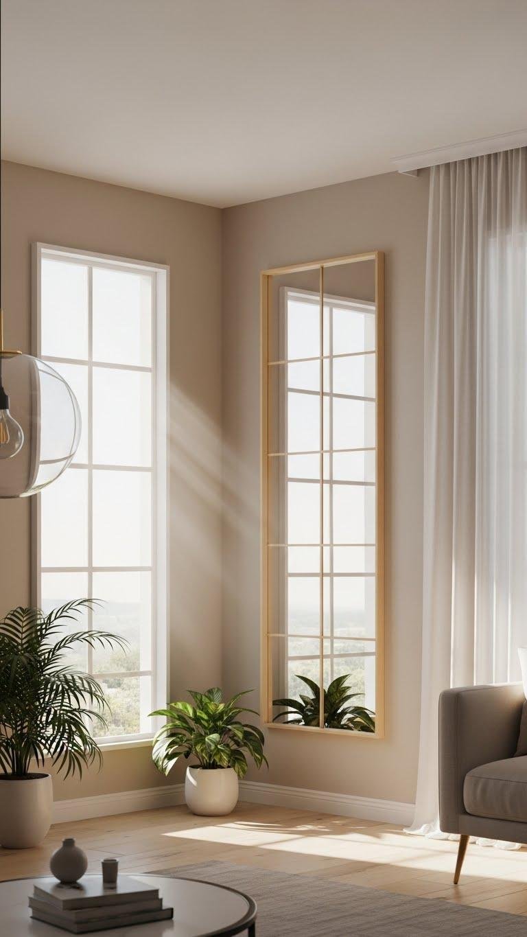 By placing tall, framed mirrors where windows would naturally sit, you’ll create the illusion of extra light and an open view without structural changes. Position framed faux windows or reflective art to echo outdoor sightlines, brighten corners, and extend sight.