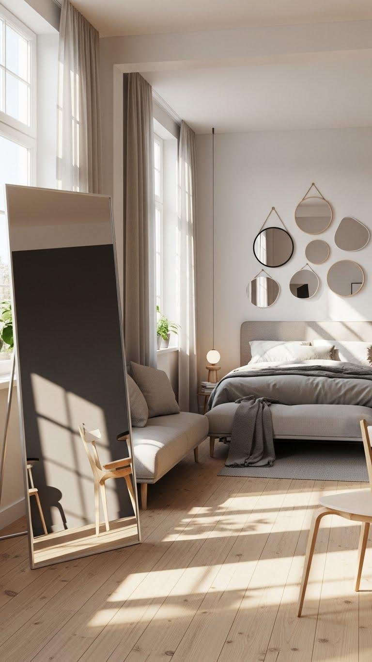In tight studio layouts, layering multiple mirrors multiplies light and visually separates zones without adding furniture. Position an angled mirror to bounce daylight into darker corners, creating depth and movement. Cluster mosaic mirrors above a sofa or bed to define a living or sleeping area while keeping sightlines open. You’ll gain brightness and a feeling of freedom without clutter or heavy partitions.