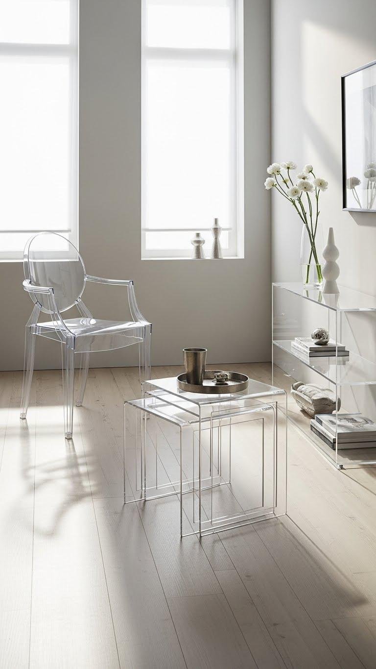 Transparency can make your small space feel instantly lighter, so bring in acrylic or Lucite pieces that visually disappear without sacrificing function. You’ll love clear acrylic seating, shelves, or console tables that preserve sightlines and let light flow. Pair a lucite nesting accent or tray with slim metallics for contrast. Choose few, versatile pieces to keep the room airy and free.