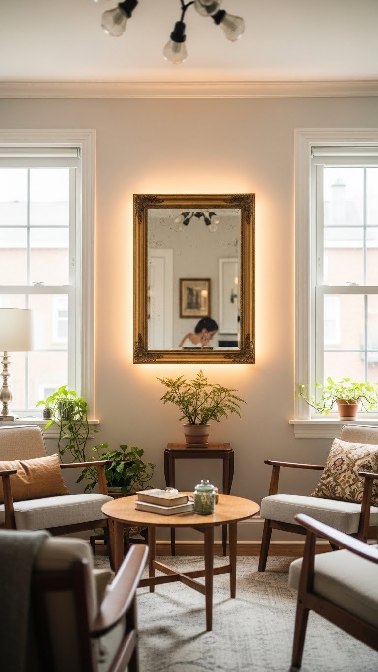 Want to make your small living room feel twice as bright and roomy? Hang an antique frame mirror to add personality and vintage charm while bouncing natural light. Position it opposite windows or a focal art piece, and use subtle LED backlighting behind the frame for depth and a modern edge.