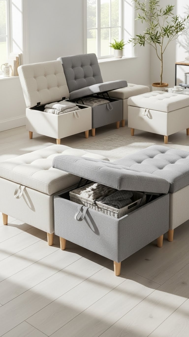 Think about an ottoman that pulls double duty: comfortable seating that tucks away clutter. You’ll love modular ottomans that reconfigure for guests or chill zones, creating flexible layouts that free your space. Choose durable fabrics, hidden hinges, and tufted storage tops for style and function. Keep palettes light, legs slim, and pathways open so the room feels liberated and easy to live in.