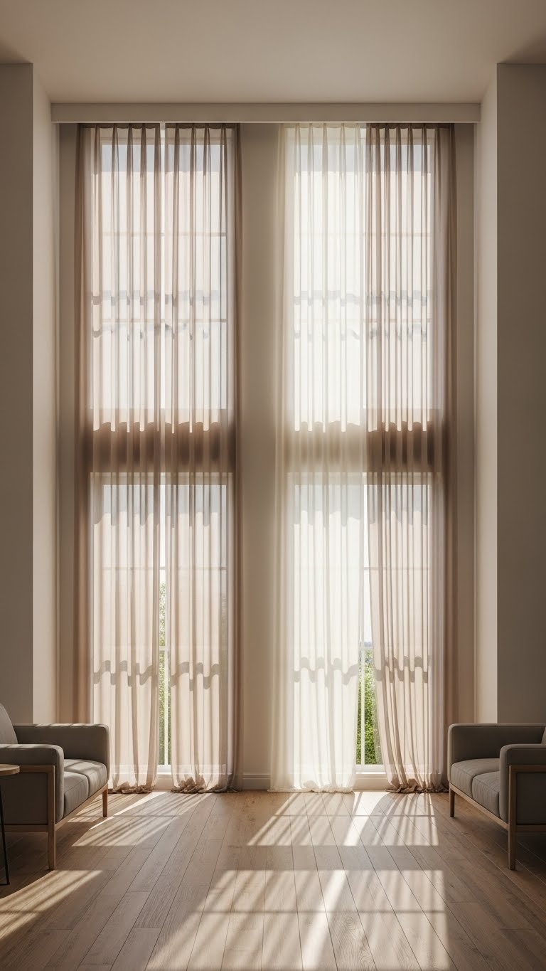 Let in as much daylight as possible by installing cafe curtains that cover only the lower half of tall windows—this preserves privacy while leaving the top panes open to flood the room with natural light. Choose lightweight sheer panels to soften glare and play with window orientation when placing seating. You’ll keep the space airy, modern, and free—privacy below, openness above.