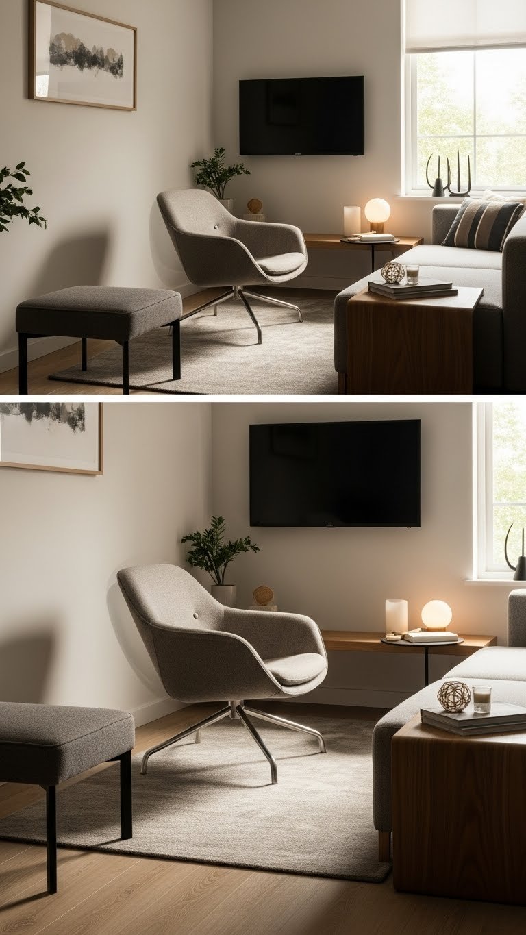 Choose a compact swivel with low profile lines and airy legs to keep sightlines clear. Embrace modular mobility: link pieces or pair with a slim ottoman so your layout shifts as freely as your plans.