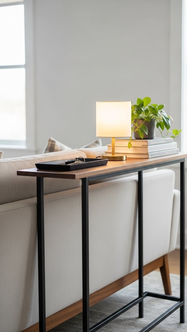 Slide a slim console table behind your sofa to add function without crowding floor space — it creates a handy surface for lamps, a tray for keys, and a low-profile backdrop that visually anchors the seating.