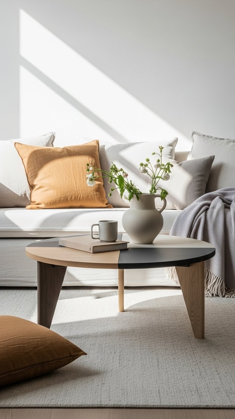 Choose a round table to keep circulation easy, mix materials for layered texture, and pick contrasting legs to add sculptural interest. You’ll create a light, modern focal point that feels open and free.