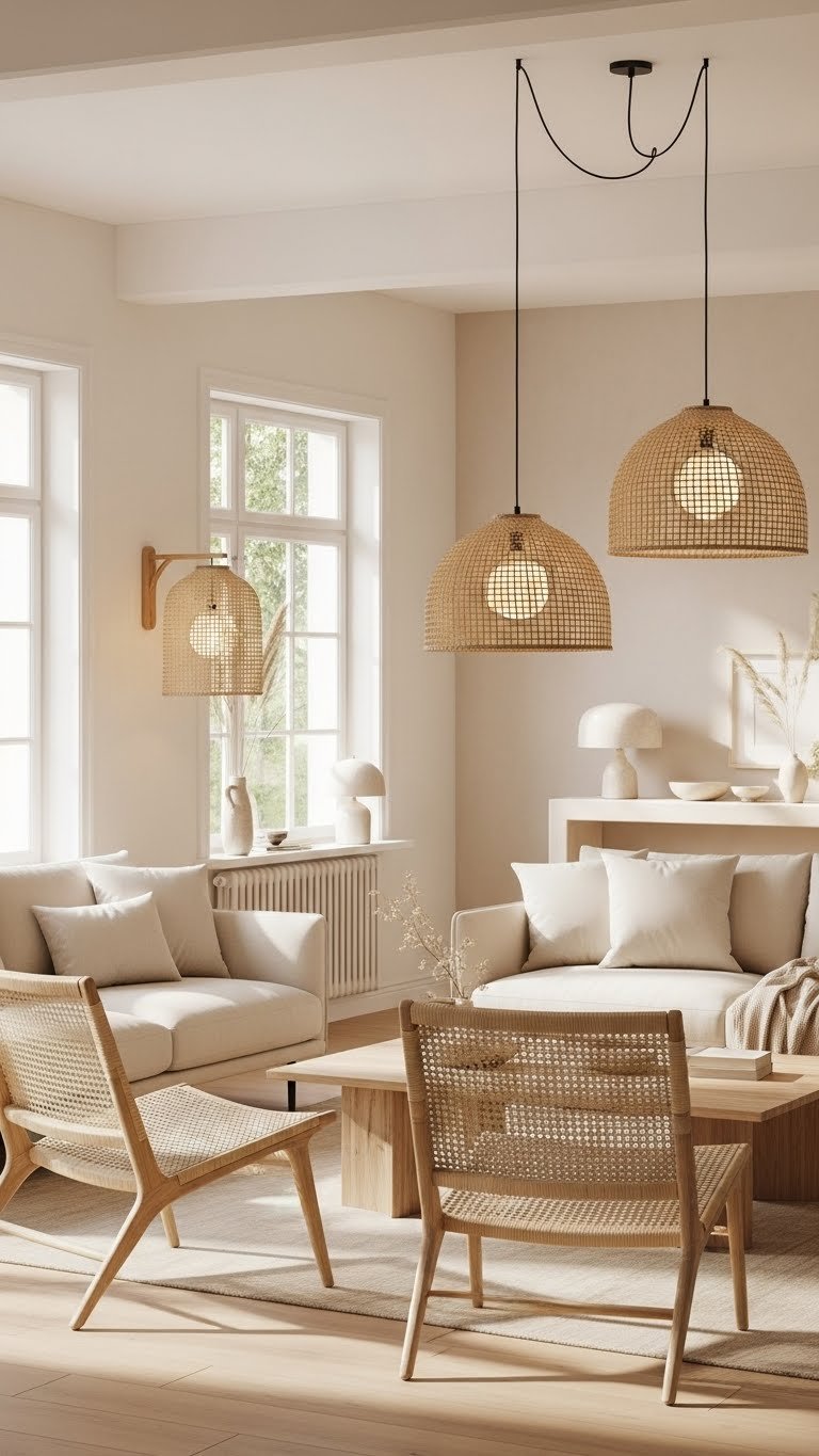 Hang open weave pendants with natural fiber shades to diffuse light softly.