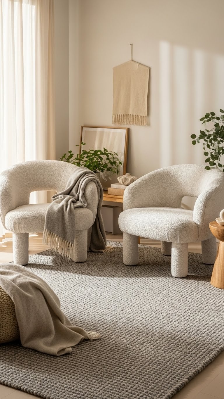Anchor the tactile story of your small living room by pairing soft boucle chairs with low-pile wool rugs—bouclé brings sculptural, cloud-like seating while wool grounds the space with warm, woven texture. You’ll mix bouclé textures and subtle wool contrasts to create cozy, modern layers. Choose compact silhouettes, muted palettes, and tactile accents so the room feels roomy, free, and intentionally curated.