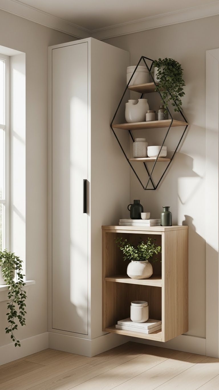 Tuck storage into overlooked corners with slim corner cabinets and open display racks that lift visual weight and free up floor space. You’ll create a hidden pantry vibe with a sleek door or use angular shelving for sculptural display.