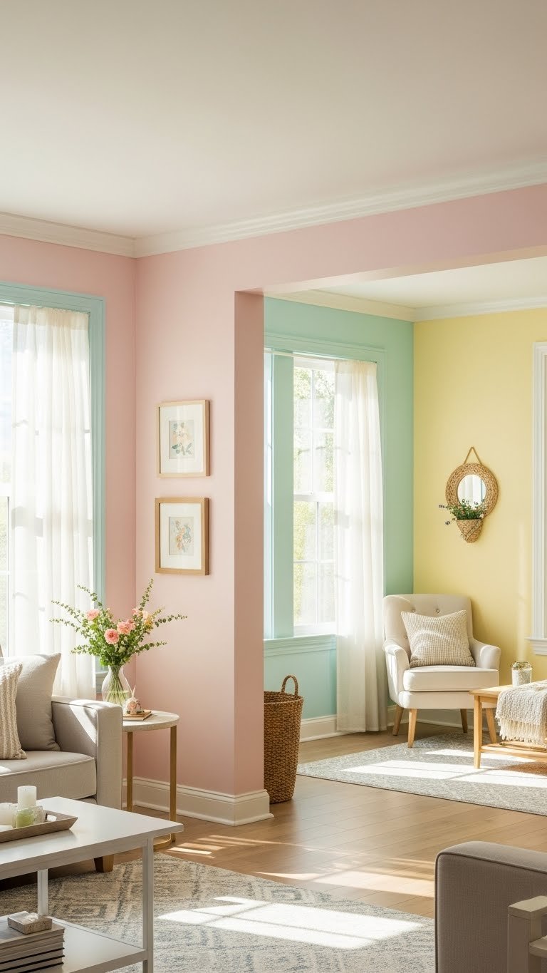 If you want a room that feels instantly inviting, layer soft pastel textiles—think whisper-pink linen throws, minty cotton cushions, and a pale lemon wool rug—to create tactile depth without overwhelming the palette.