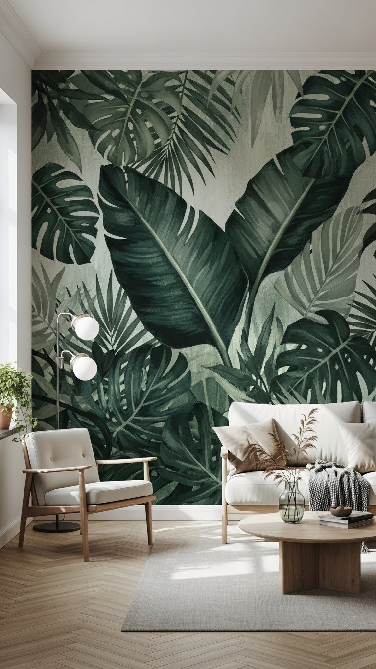 Oversized botanical wallpaper creates an instant focal-point wall that anchors a room and brings lush, natural texture indoors. Choose a scaled print and a textured mural finish to add depth; measure precisely, match patterns, and install on one wall to keep impact bold yet balanced.