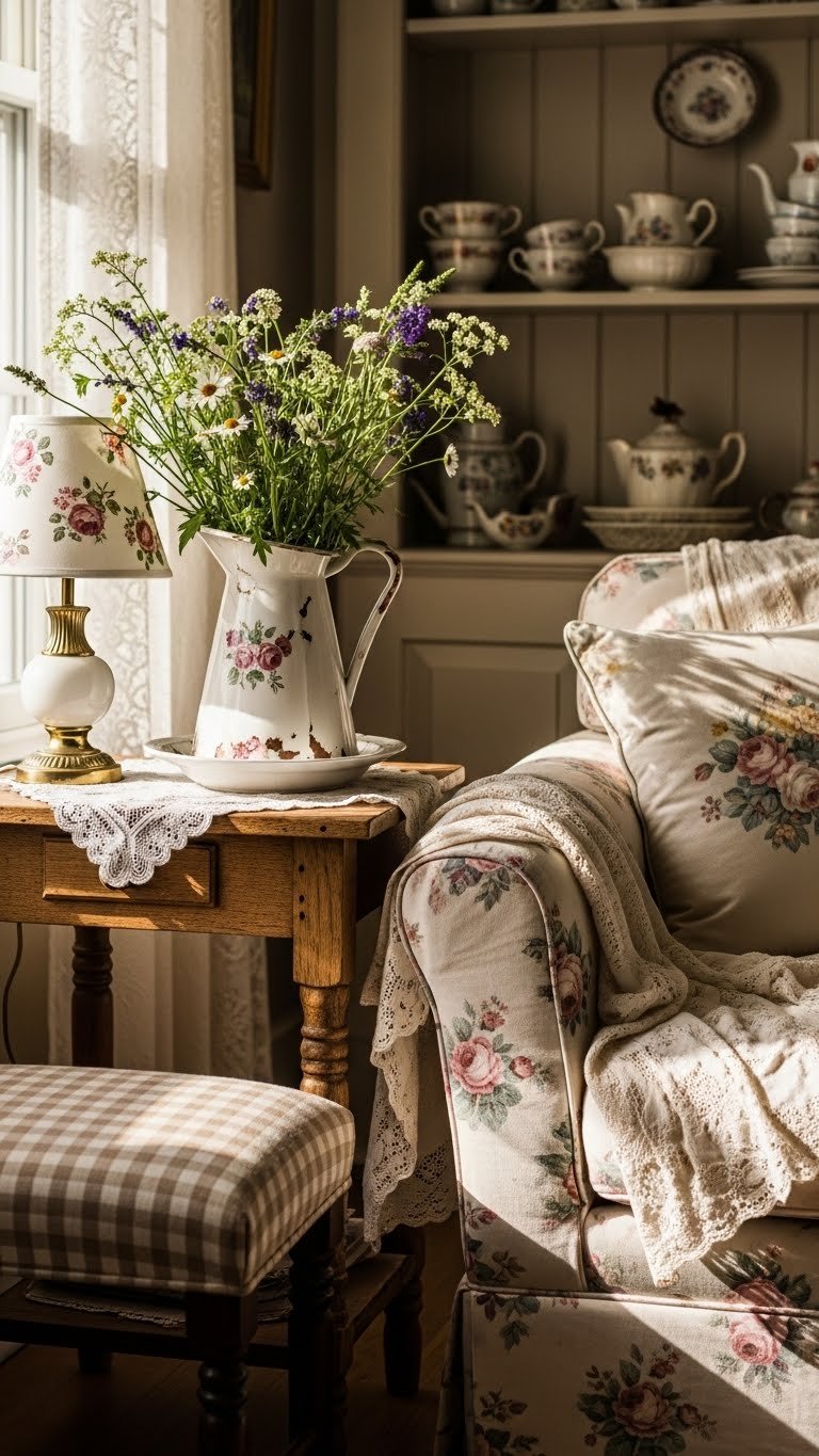 When you pair well-worn vintage finds with cottagecore florals, you get a home that feels curated yet effortless—think a chipped china pitcher brimming with wildflower stems, a distressed oak side table anchoring a dainty floral lamp, and a faded floral-print slipcover softened by heirloom lace. Mix antique teacups into open shelving, layer gingham upholstery on a footstool, and let each piece breathe.