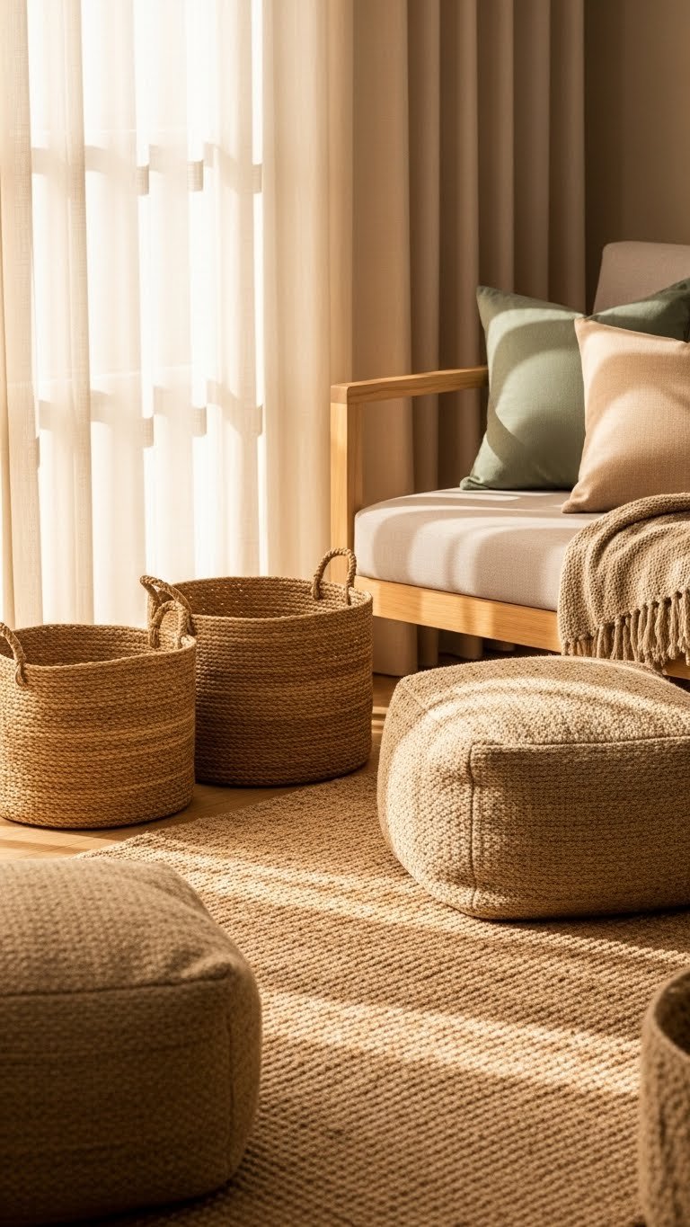 Bring in jute rugs and natural-fiber accents to ground a room with tactile warmth and easy, lived-in style. Layer a low-profile jute rug under seating, add woven jute baskets for tidy storage, and introduce hemp poufs for flexible seating. You’ll create a breathable, unpretentious vibe that feels liberated and practical — durable textures that age beautifully and invite relaxed everyday living.