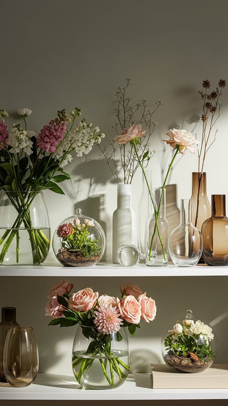 How can simple blooms transform a shelf into a curated focal point? You’ll mix fresh flowers with glass terrariums, slender vases, and a few dried stems for texture. Arrange heights, leave negative space, and rotate seasonal blooms. Keep palettes restrained, let light play off glass, and choose vessels that echo your free, unfussy aesthetic — practical, stylish, and effortlessly alive.