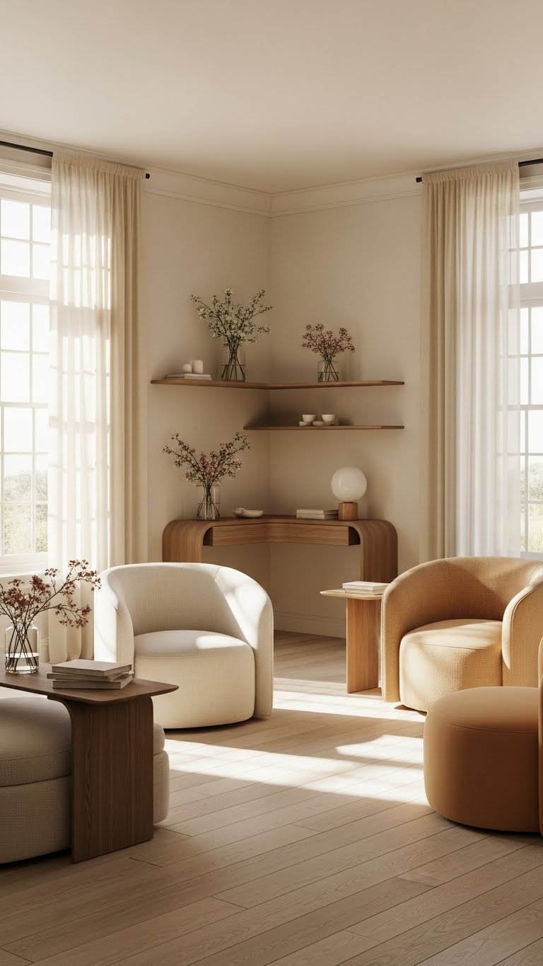After styling shelves with soft blooms and glass, widen the room’s language by introducing curved furniture to encourage a gentler, more organic flow. Choose rounded armchairs to soften corners and invite lounging; pair them with slim curved consoles to maintain openness.