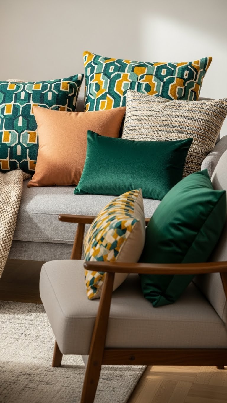 You’ll mix geometric prints with solids and contrasting textures—think linen, velvet, and nubby weaves—to energize sofas and chairs.