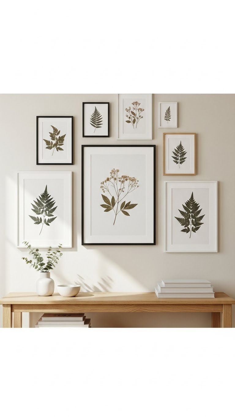 Vary sizes, align a central anchor piece, and keep consistent mats to unify the gallery. You’ll create an airy, intentional display that celebrates nature while staying modern — easy to update as seasons or moods shift.