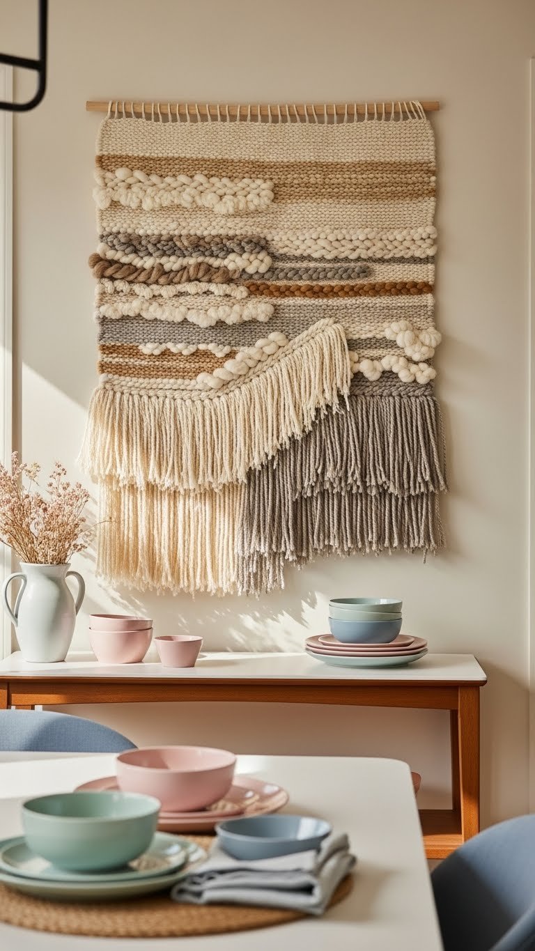 After you’ve layered pastel tableware to soften the dining room, bring that same tactile warmth to your walls by hanging a statement woven piece. Choose neutral tones and bold scale to anchor the room, then play texture for tactile contrast. Mount it slightly off-center above a console, secure with proper hardware, and let the artisanal weave set a freeing, curated focal point.