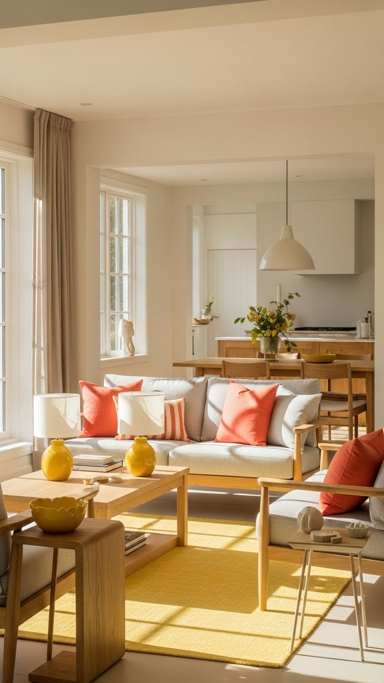 Brighten up the room by weaving butter yellow and coral into your palette—use yellow to lift and coral to punctuate so the space feels sunny without going overboard. Choose butter yellow accents in lamps, vases, or a lightweight rug to create warmth. Add coral throw cushions for instant energy. Balance with neutral linens, natural wood, and open layouts so your home feels free and effortless.