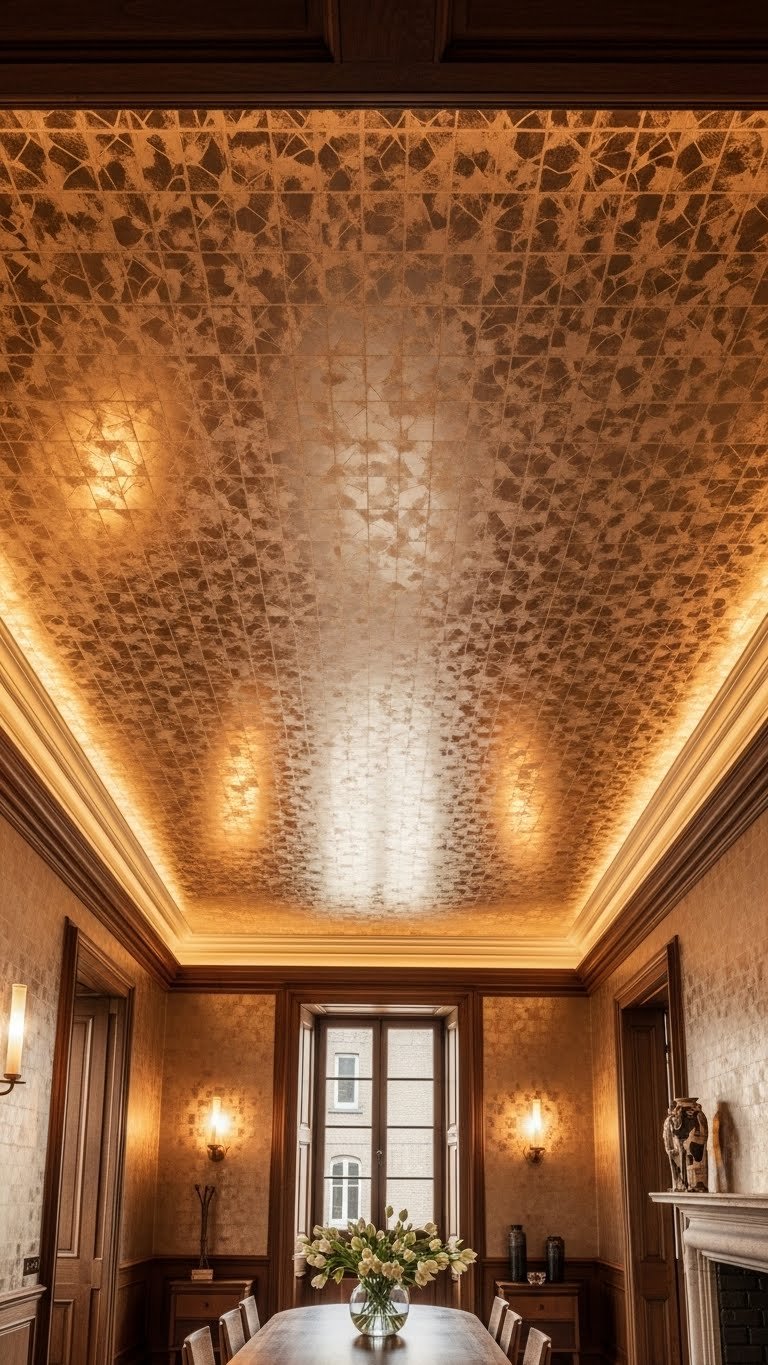 Lift your gaze and let the ceiling become the room’s signature — wallpapering it adds instant drama and pulls a space together without overcrowding the floorplan. Choose metallic wallpaper for reflective warmth, or pick a pattern that complements existing woodwork. Prep textured ceiling surfaces first, smoothing or priming as needed. You’ll gain a liberated, elevated look that reads intentional and feels surprisingly effortless.