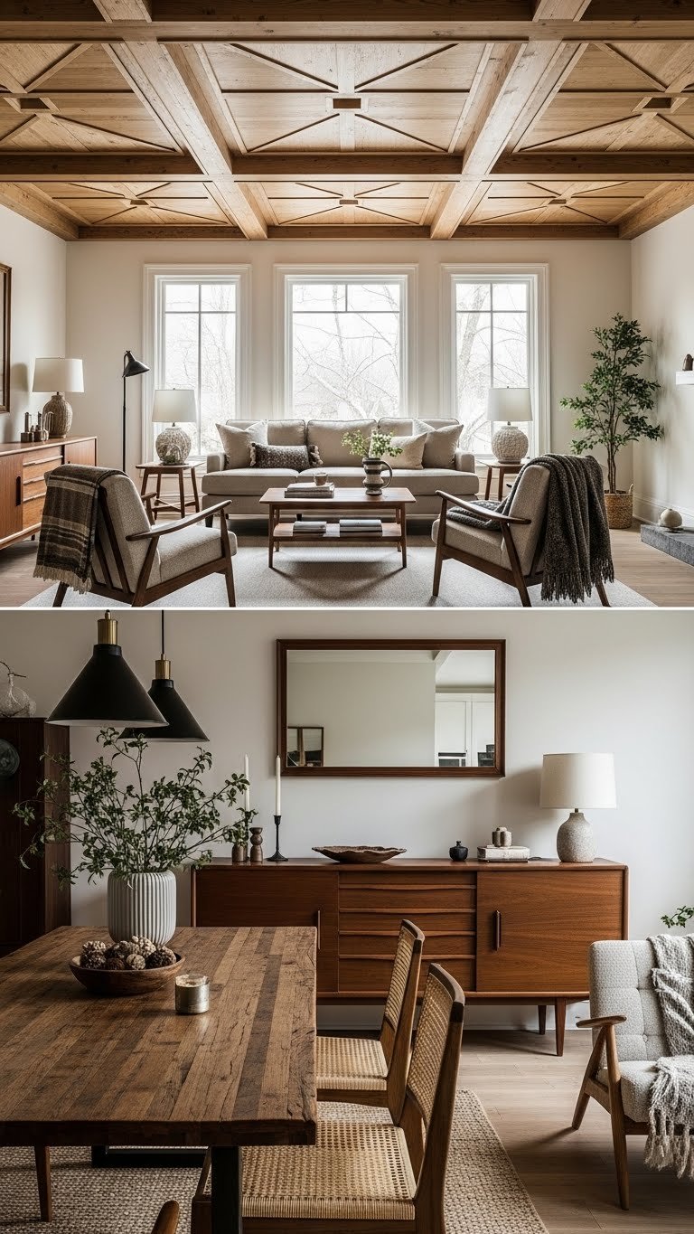 After you let the ceiling make the statement, balance that polish with furniture that feels grounded and lived-in: pair the clean lines and tapered legs of mid-century pieces with the rough-hewn textures and warm patina of rustic elements. Mix teak accents with woven textures, pick a neutral palette, and let statement chairs, a reclaimed table, and minimalist lighting create a liberated, curated room you’ll actually use.
