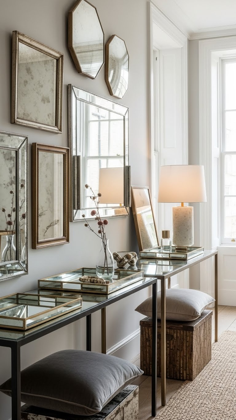 When you bring mirrored surfaces into a room, they do more than bounce light — they amplify depth and highlight texture, making small or dim spaces feel airy and intentional. You’ll mix antique mirrored frames with sleek geometric mirrors to create contrast, positioning them opposite windows or lamps. Choose lean consoles, mirrored trays, and layered reflections to expand sightlines and invite a liberated, luminous vibe.