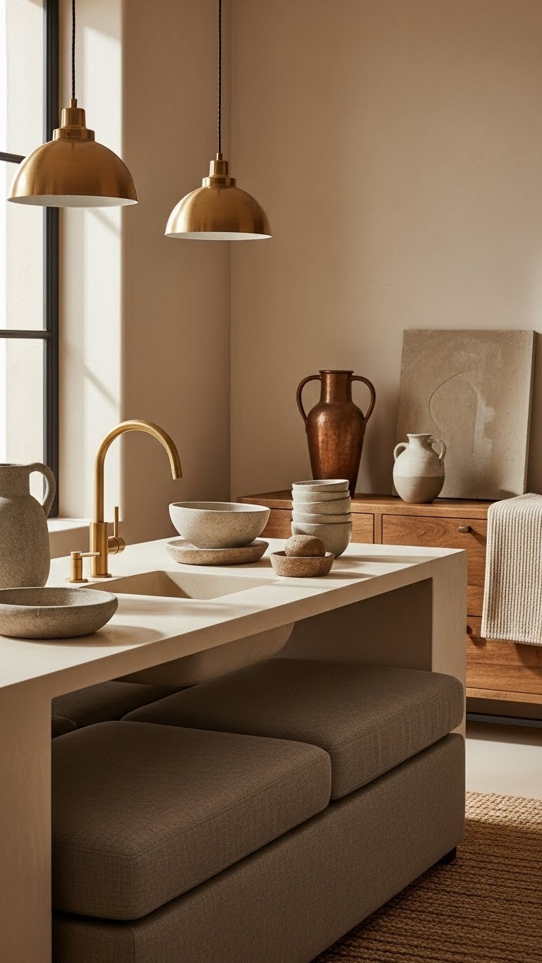 You’ll mix brushed brass fixtures with linen taupe textiles, balance antique copper accents against stone hues, and choose simple forms that let textures sing. This approach feels liberated and effortless, so you can refresh rooms with restraint and confident, unfussy style.