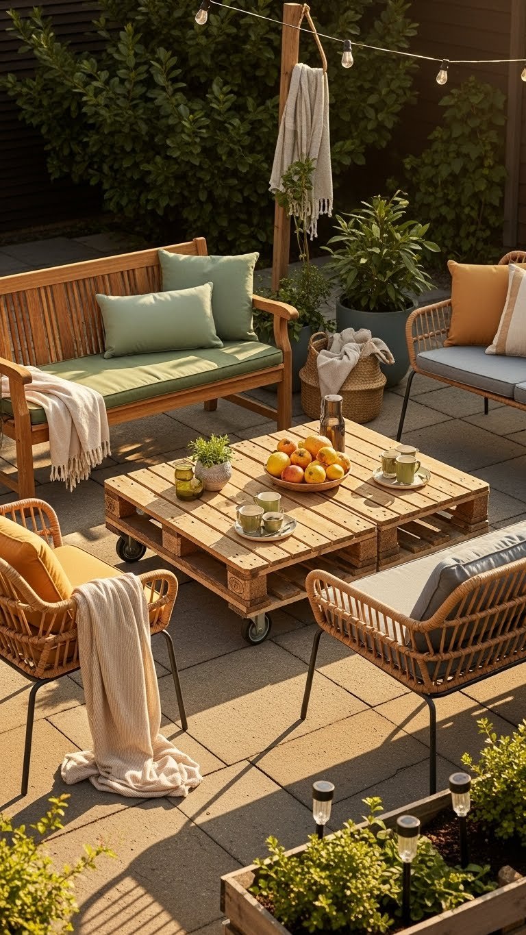 Mix in upcycled pallets for modular tables and planters, add solar lighting for effortless evening ambiance, and pick low-maintenance textiles so you can relax freely and confidently outdoors.
