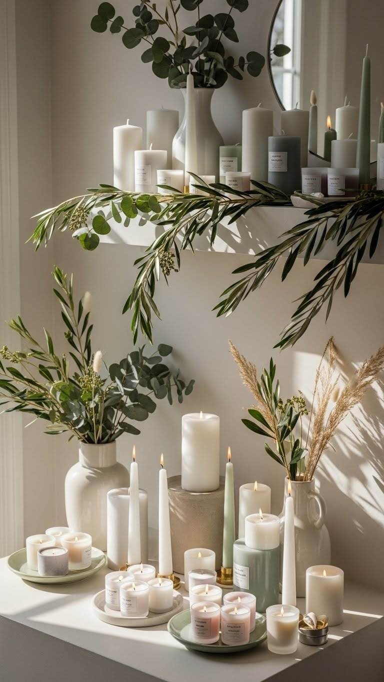 Arrange scented votives in small clusters, stagger pillar heights, and drape botanical garlands loosely.