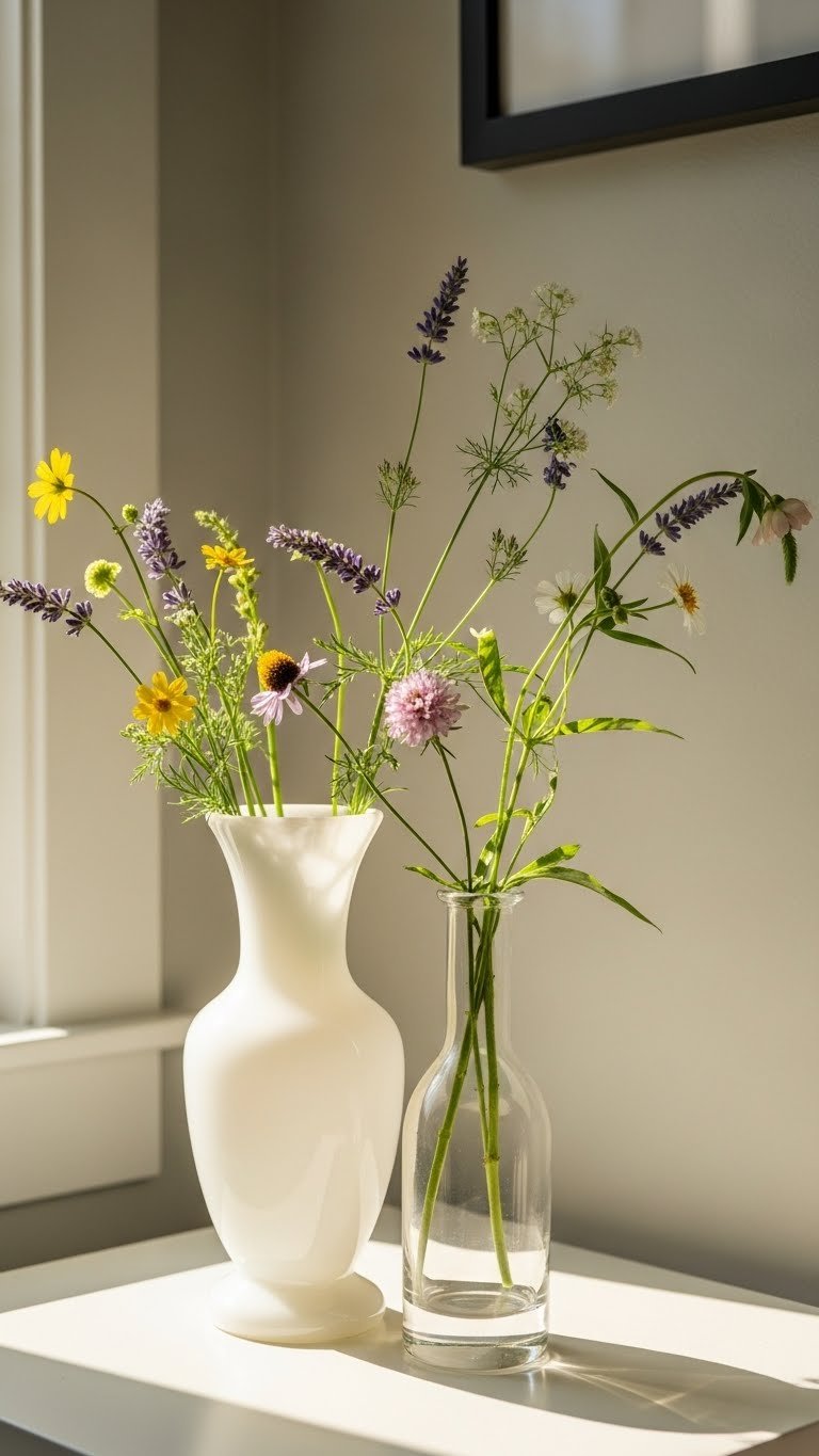 Place a fresh floral vase on a side table to give your entryway an immediate burst of color and life. You’ll pair a vintage milkglass with a minimalist budvase for contrast, letting single stems breathe.