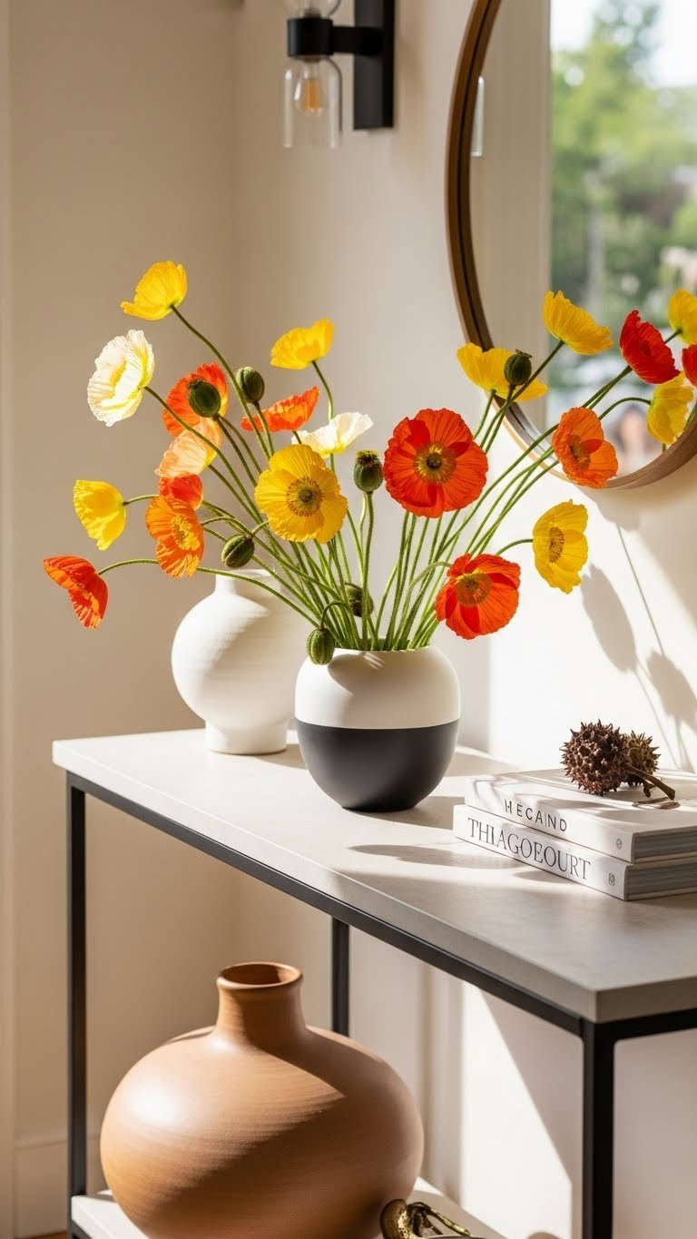 Bring bold energy to your entry console with a bright poppy arrangement that greets guests like a sunny hello. You’ll choose vivid blooms and pairing vessels that emphasize vibrant contrasts and airy space. Arrange stems loosely for movement, add a few seed pods for seasonal symbolism, and keep surrounding decor minimal so the display feels free, intentional, and effortlessly inviting.
