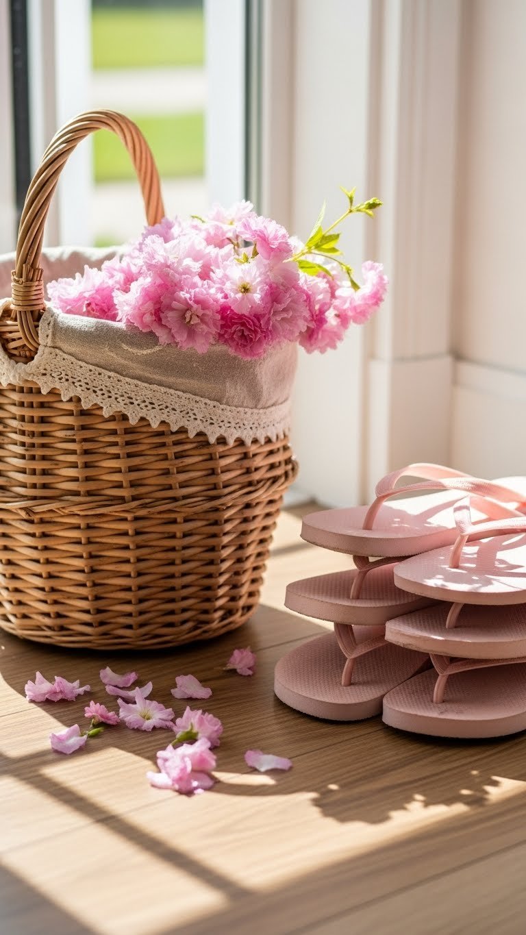 You’ll place a curated blossom basket by the door and drape pink flipflops nearby, signaling relaxed hospitality.
