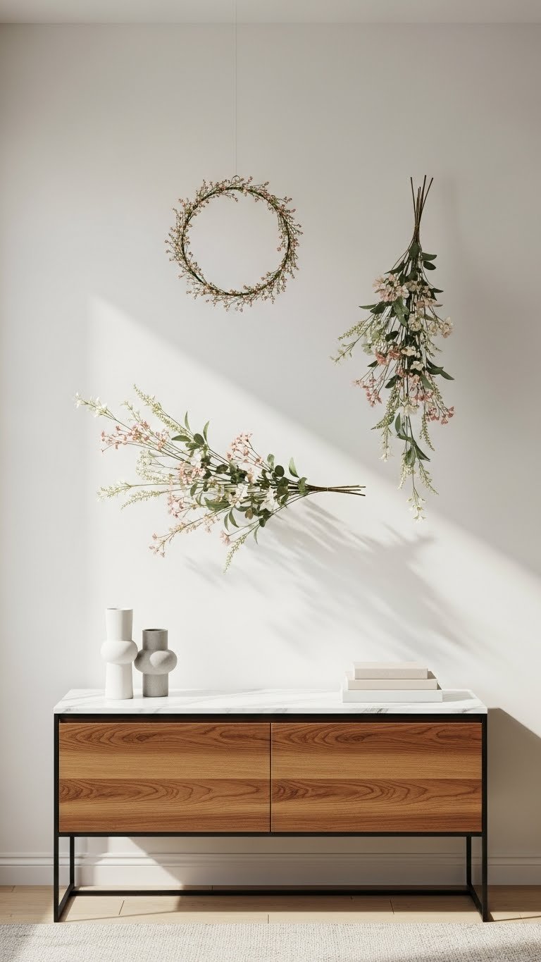 Hang a delicate spray of faux flowers just above the console to give your entryway an elevated, artful moment that still feels effortless. You’ll pair a subtle hanging garland with a light suspended wreath or asymmetrical cluster, choosing airy stems and muted tones.