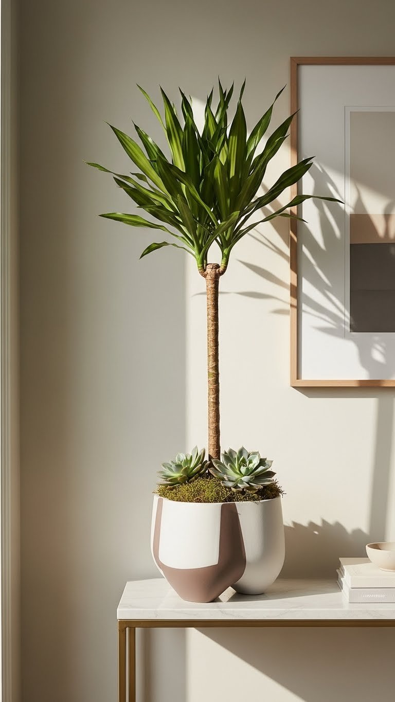 To balance the airy, suspended florals, bring in a single tall plant in a sleek, modern planter to anchor the console and add vertical energy. You’ll choose an architectural dracaena for height, pair it with a succulent cluster and minimalist moss at the base, and select sculptural castings for the pot.