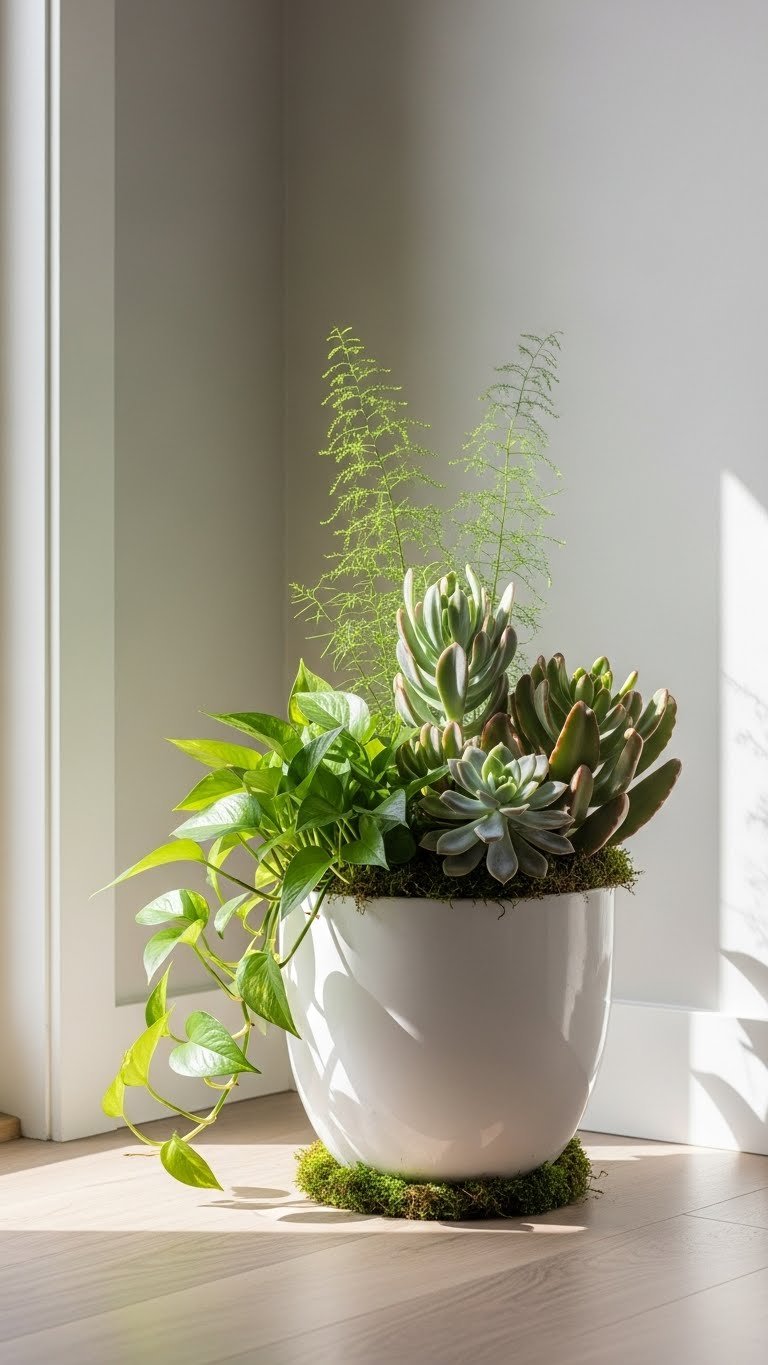 You’ll pair trailing pothos, a sculptural succulent cluster, and airy ferns for texture contrast.