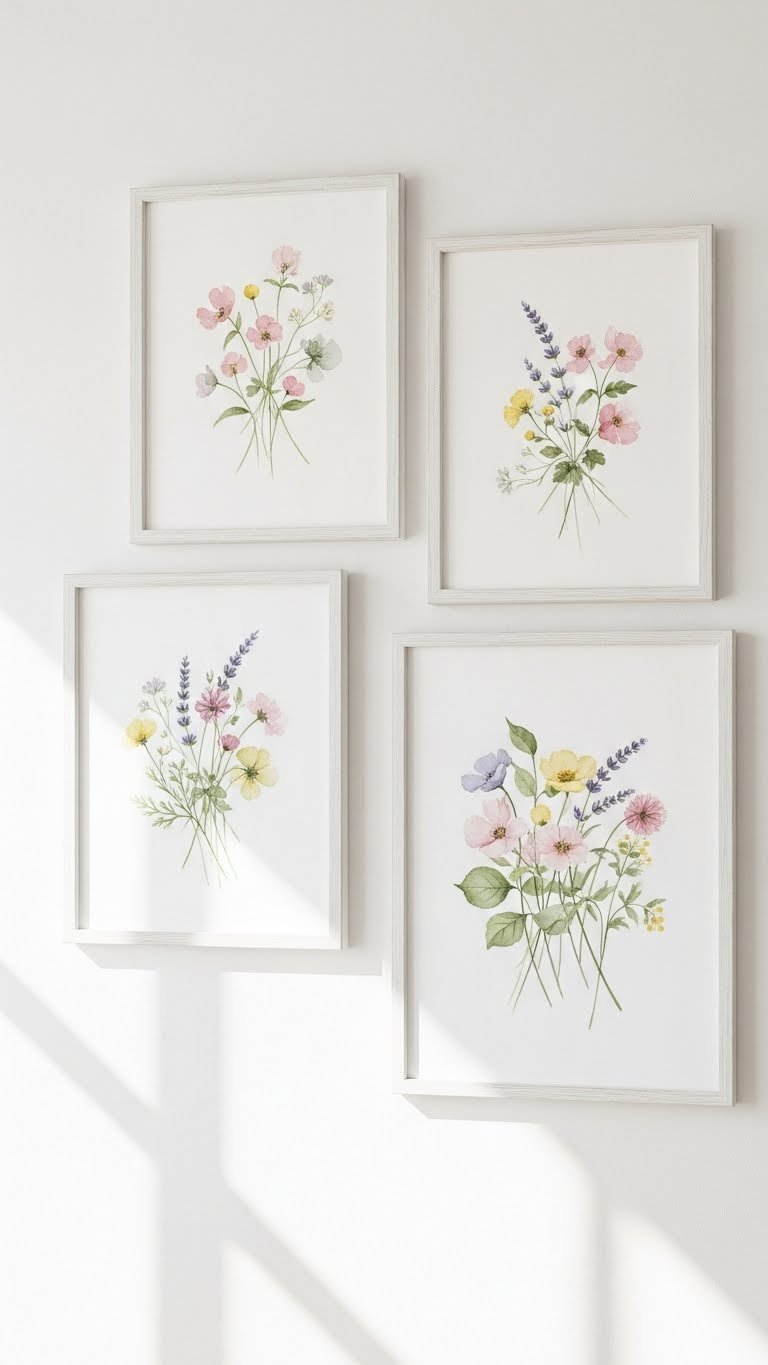 Often you’ll find that wildflower artwork breathes fresh, effortless life into white walls, its delicate colors and organic shapes creating a relaxed focal point without overwhelming the space. You’ll choose pieces with loose wildflower patterns and airy compositions, pairing them with simple whitewash frames to keep things light. Hang them asymmetrically, let negative space breathe, and let the entry feel open and free.