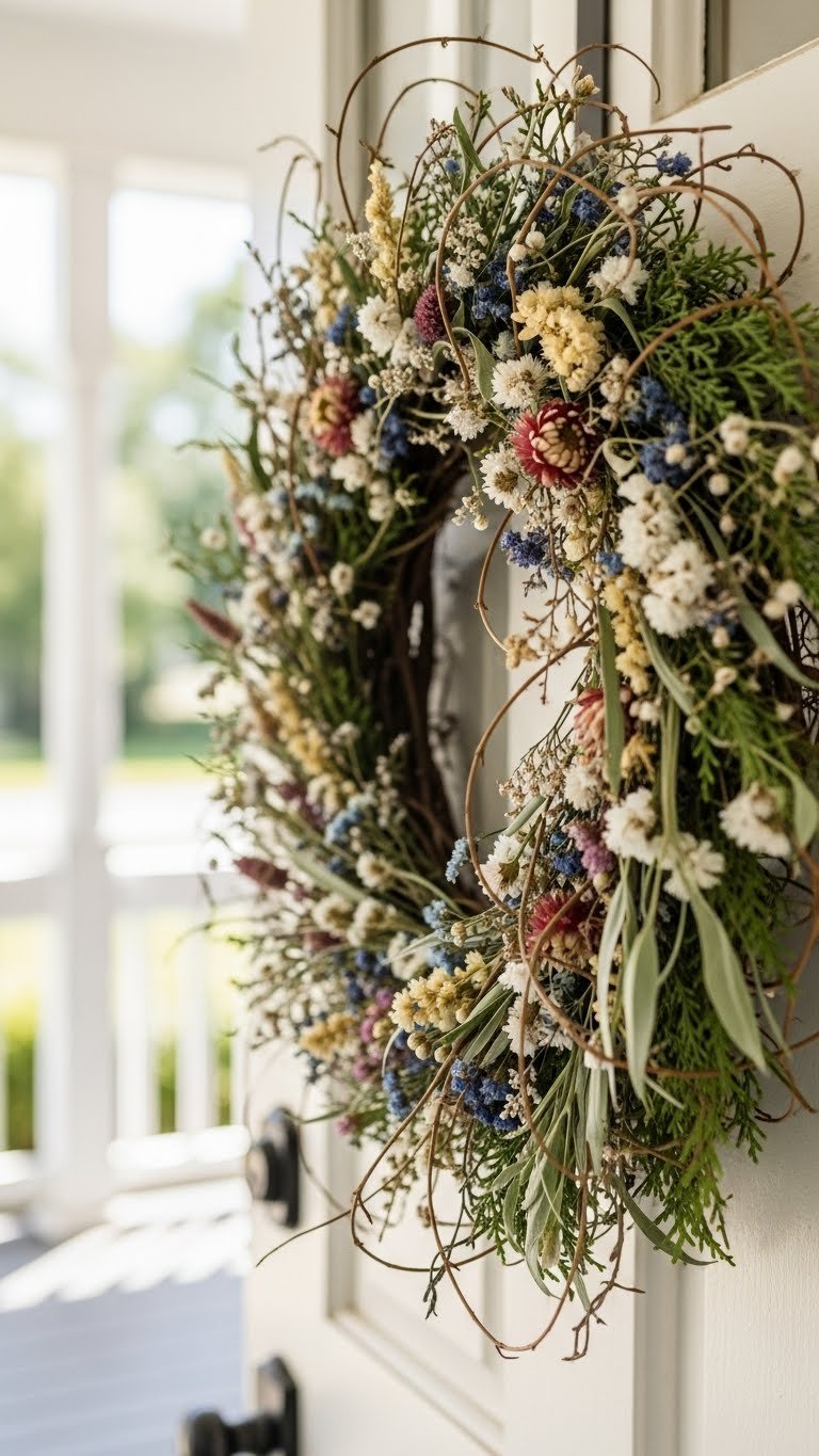 You’ll choose botanical textures that feel lived-in yet curated, mixing airy vines, dried blooms, and fresh sprigs. Select seasonal colorways to keep the look fresh, bold, and freeing — an immediate, effortless welcome.