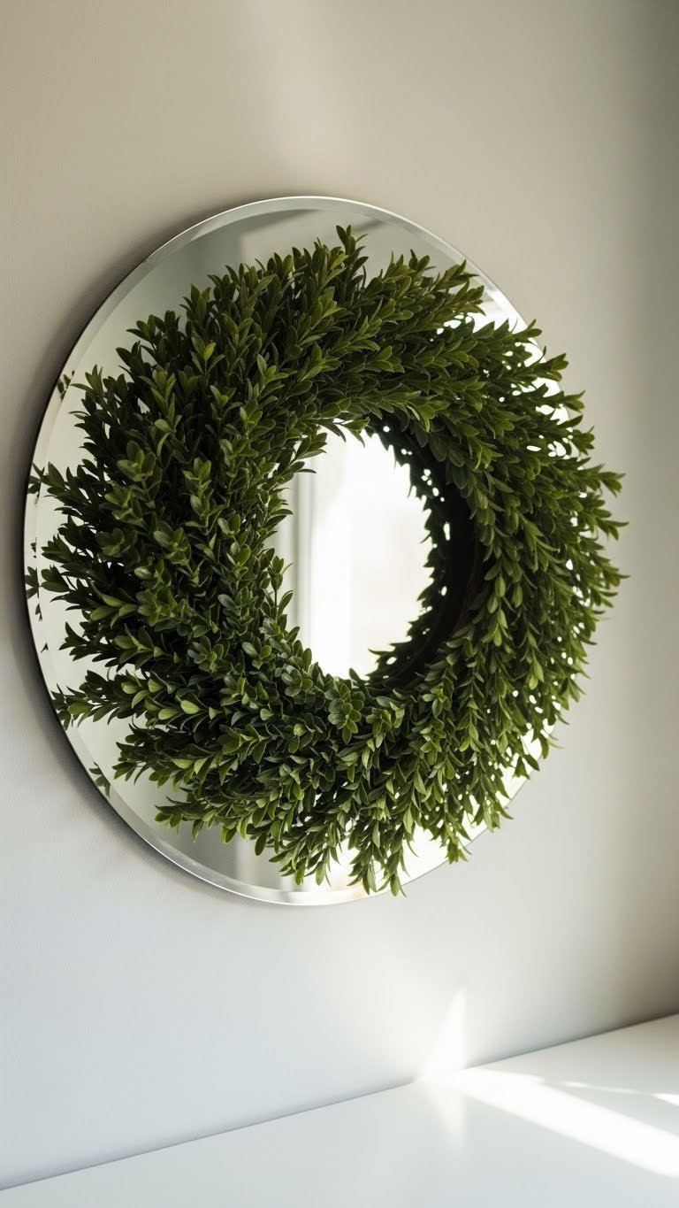 You’ll hang mirror greenery centrally, letting simple wreath styling reflect light and space. This curated, modern touch feels freeing — orderly, green, and effortlessly welcoming as guests arrive and you leave.