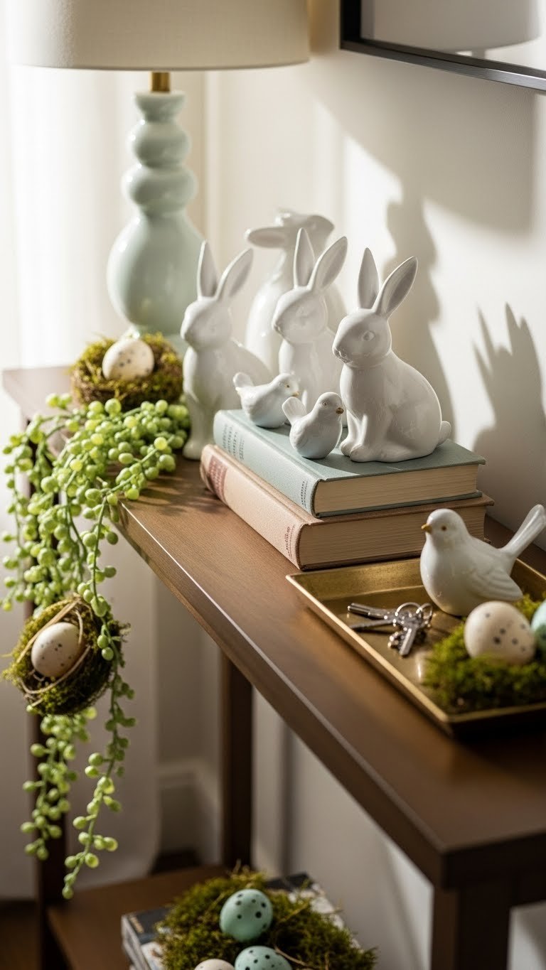 A slim console table becomes a quiet stage for spring when you group a few ceramic bunnies and delicate bird figurines among a stack of vintage books and a shallow tray for keys.