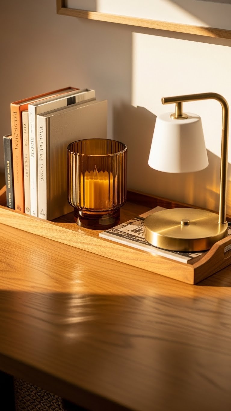 You’ll arrange stacked novels beside an amber lantern-style candleholder, keep lines clean, and let warm light invite movement. It’s curated, airy, and freeing—practical art at your threshold.
