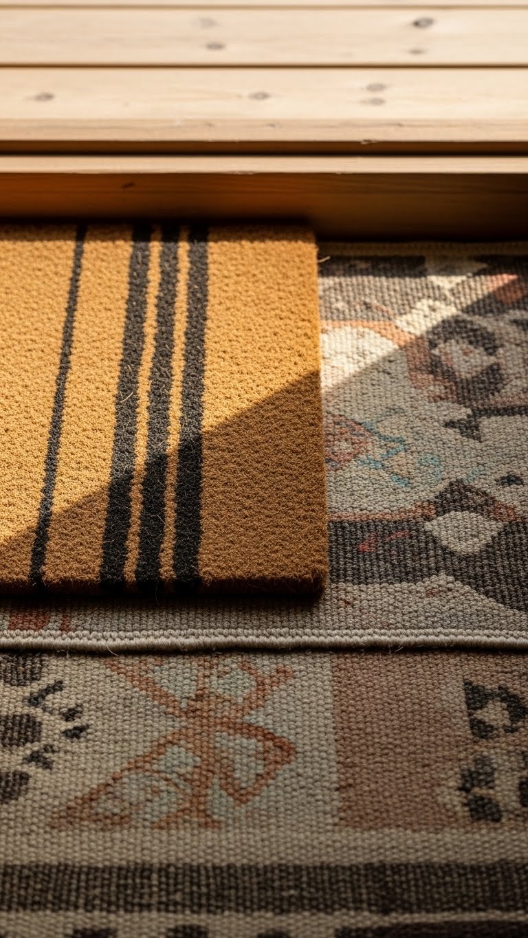 Softening your entry with a layered doormat and vintage rug grounds the space while adding seasonal charm. You’ll pair a durable striped coir mat for grit with a faded kilim beneath to introduce texture and muted color.