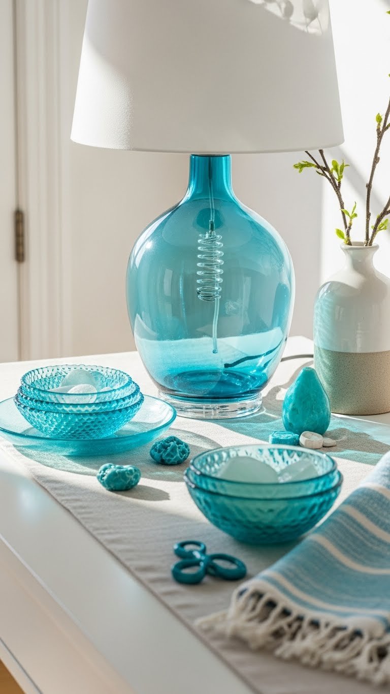 Bring in a blue glass lamp to lift the entry’s mood and introduce a cool counterpoint to your linen runner; its translucent body catches morning light and adds a jewel‑like accent without shouting for attention. You’ll layer sea glass bowls, coastal charm accents, and turquoise accents nearby, pairing breezy textiles and a simple vase of sprigs so the space feels curated, airy, and free.