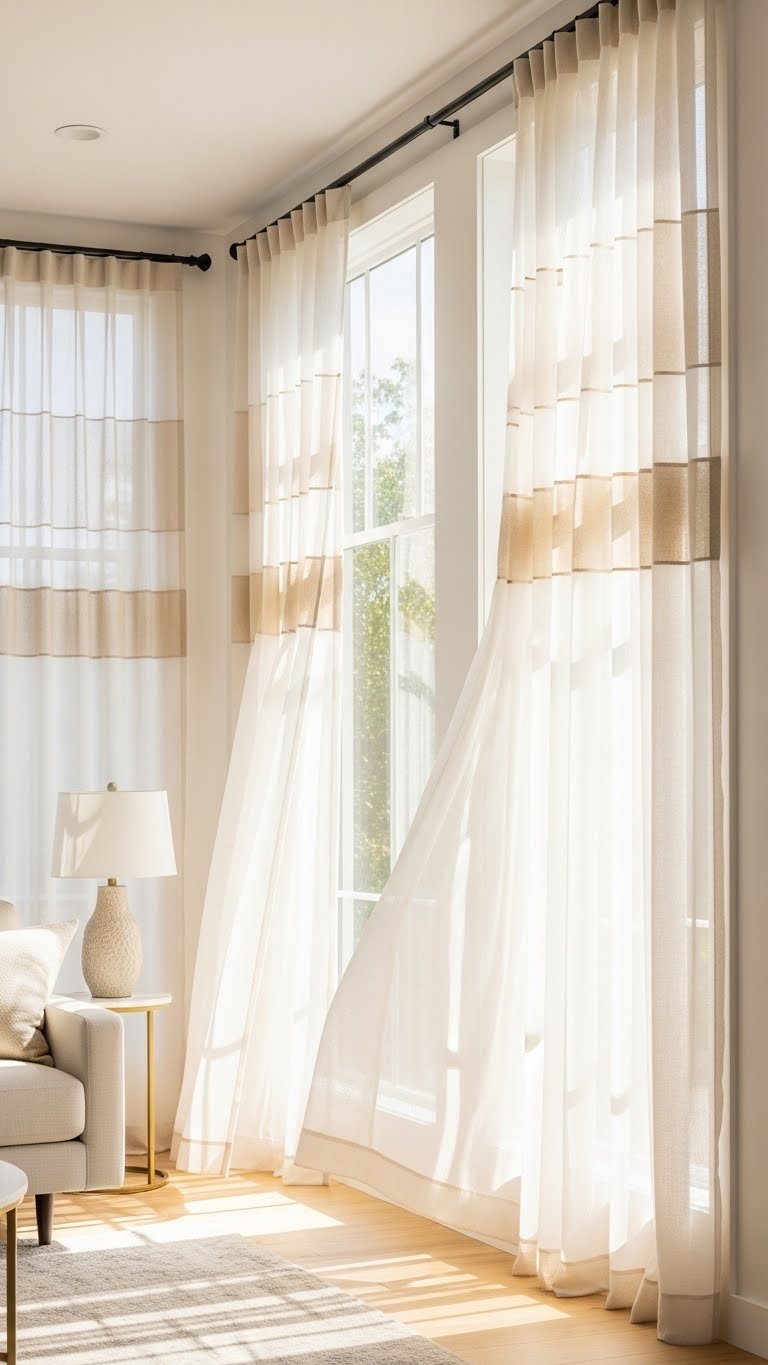 Once you’ve opened up your windows and let daylight do the heavy lifting, swapping heavy drapes for dramatic sheer curtains gently refines that luminosity while keeping the room feeling soft and airy. Choose layered sheers for depth and privacy, hang them on bold statement rods, and let fabric float to the floor. You’ll create breezy, liberated rooms that read modern and intentional.