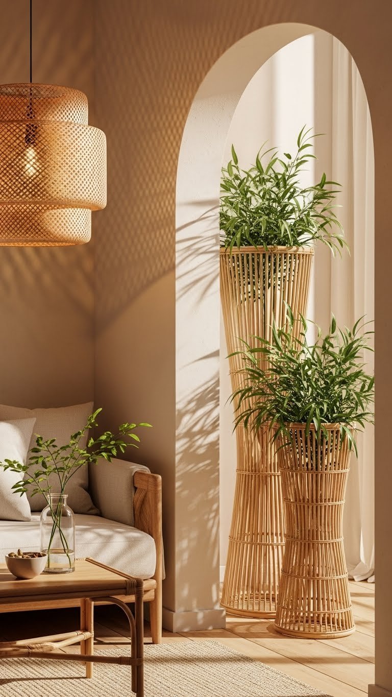 You’ll mix rattan lighting with sleek textiles, balancing texture and light. Add bamboo planters for sculptural greenery and easy movement between rooms.