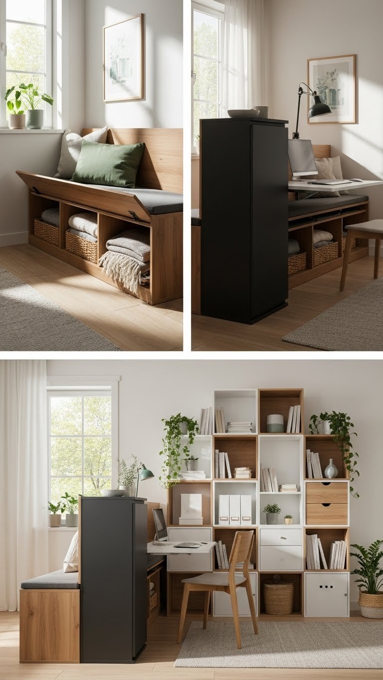 Carve out distinct zones that flex with your day-to-day by layering storage that works as furniture and organizer — think a bench with hidden compartments, slim cabinets that double as room dividers, or modular shelving you can reconfigure for work, play, and display.