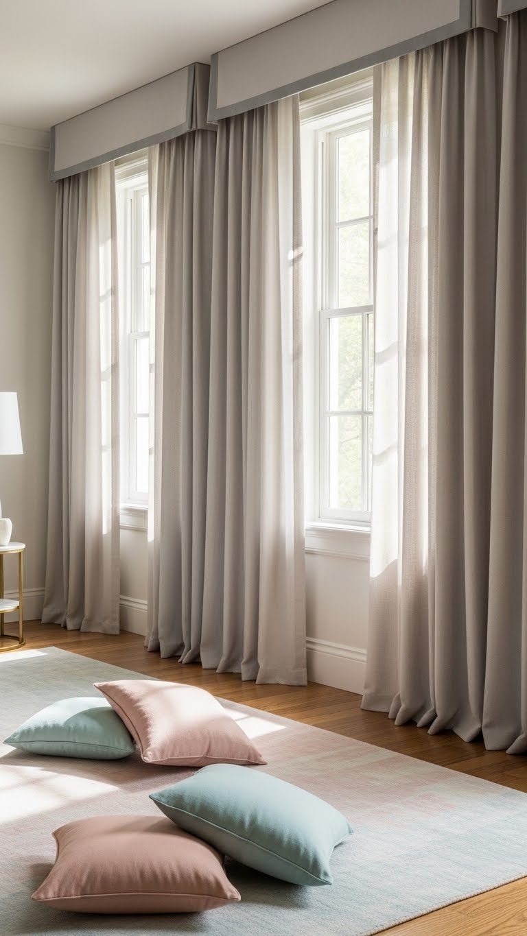 After you’ve freshened textiles with pastel rugs and pillow covers, refocus on the windows to give the room a deliberate design anchor: pleated drapery with a tailored trim creates an instant focal point that frames light and adds sculptural rhythm.