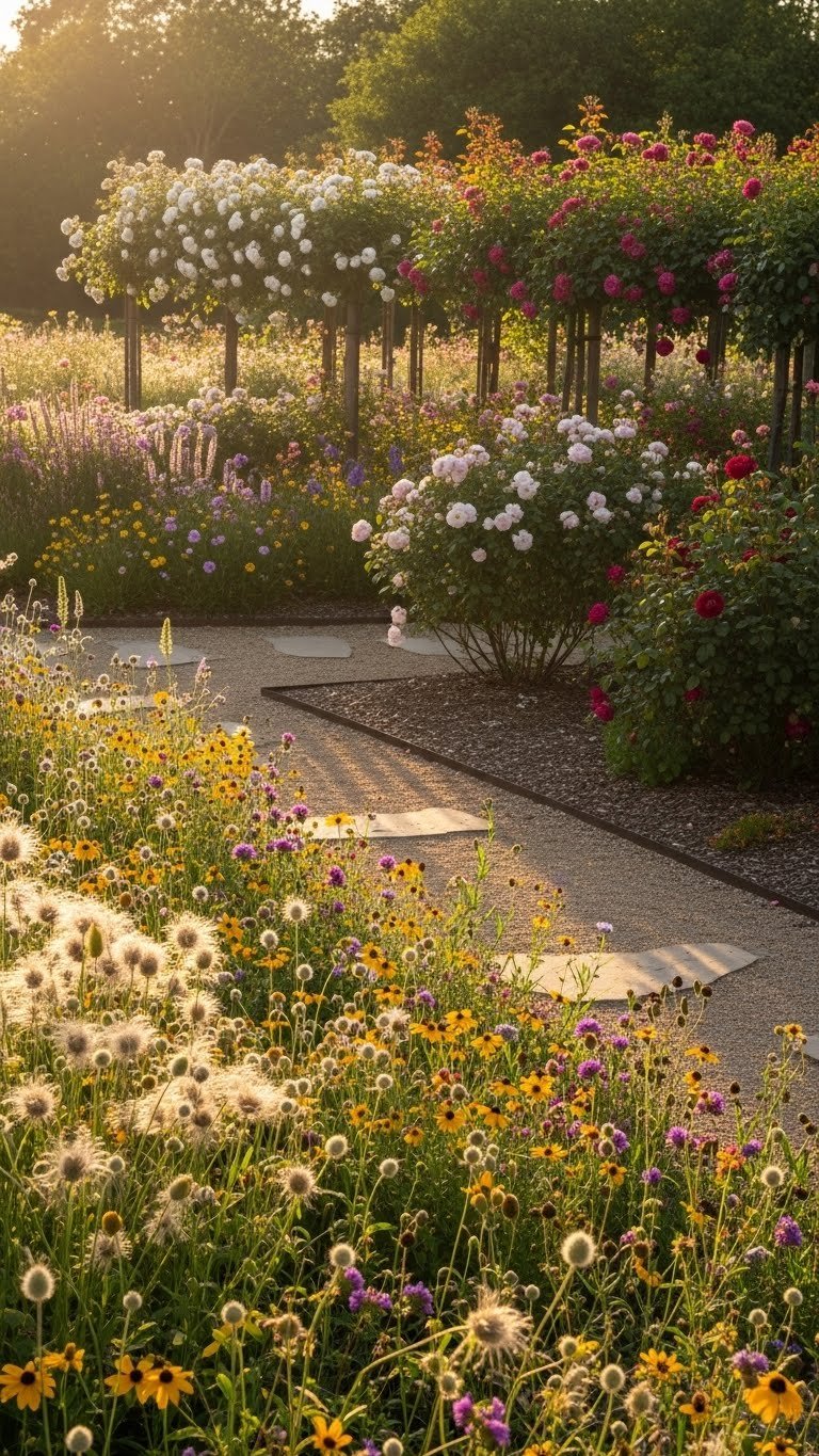 Planting a layered mix of wildflowers and roses will instantly soften hard edges and invite pollinators into your yard, giving it a relaxed yet curated look.