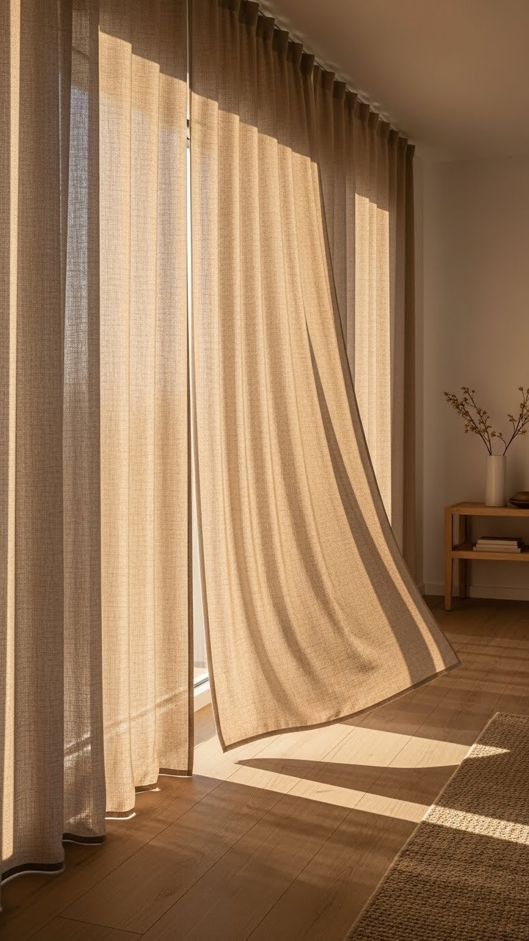 Softly filtering light, sandy linen drapes give your room an instant uplift — they diffuse sunlight without losing the warm, neutral tone that defines spring minimalism. You’ll choose neutral weight fabric for breathable, natural light filtering that feels effortless. Embrace beach inspired pleats for relaxed movement, and follow simple linen care tips so the drapes stay soft, breathable, and free — just like you want.