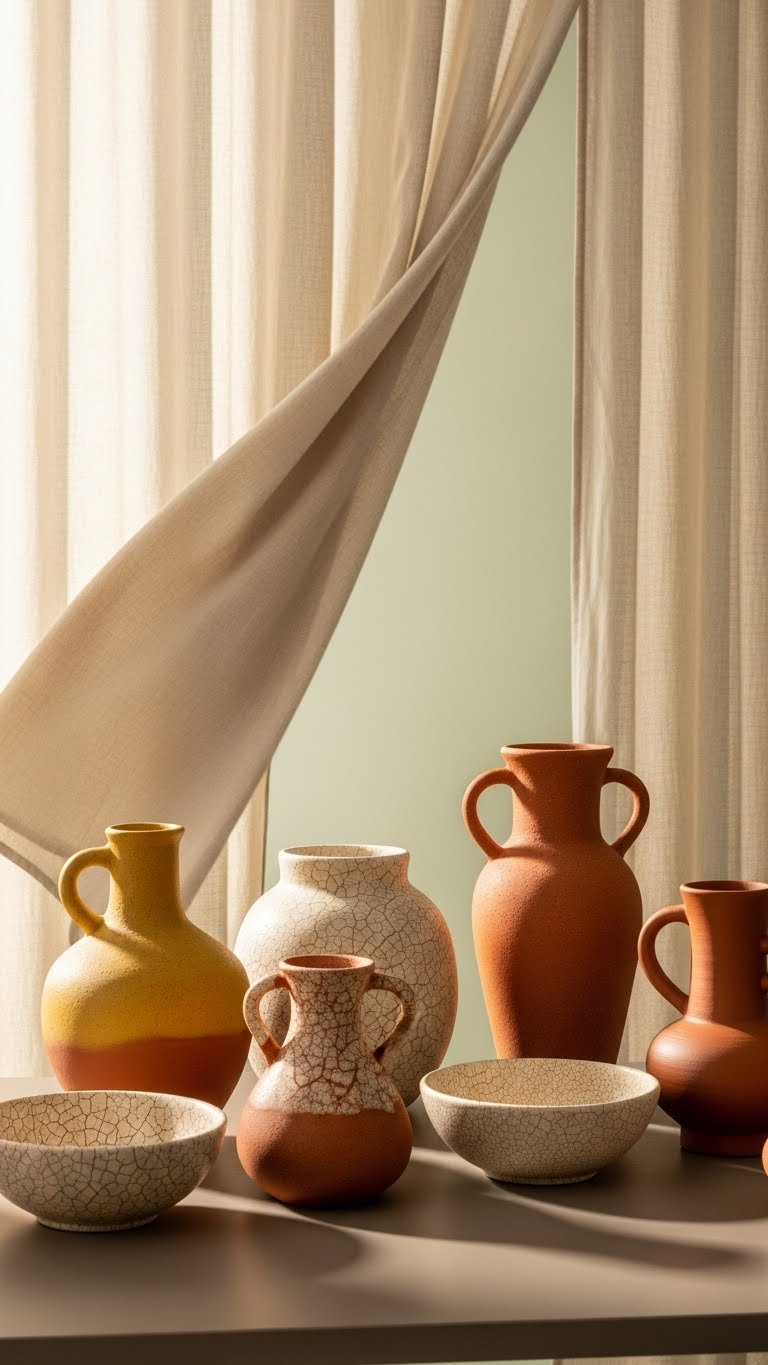 Earthy clay-toned ceramic vases anchor a spring neutral scheme by adding tactile warmth and sculptural simplicity to a room. You’ll choose pieces with handmade textures and matte finishes to create effortless, lived-in elegance. Place single stems or bare branches to let form speak, mix heights for rhythm, and trust muted clay hues to free your space from fuss while staying unmistakably modern.