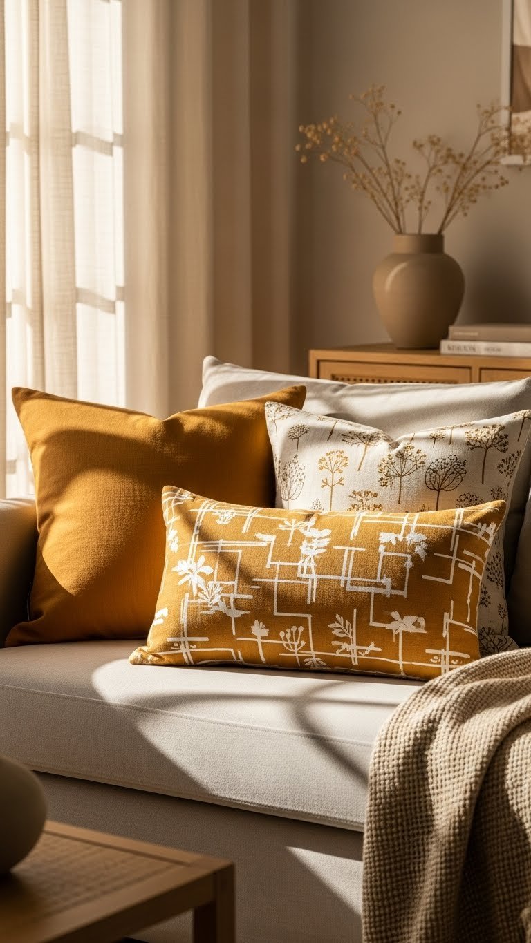 Pairing warm beige walls with soft caramel throw pillows instantly deepens the room’s warmth while keeping the palette grounded and modern.
