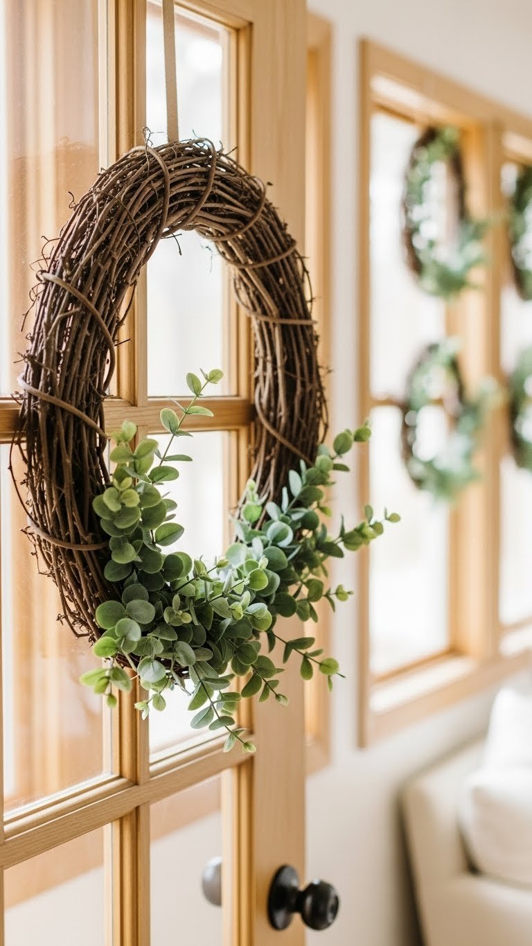 Bring a simple vine wreath onto your interior doors to add effortless, seasonal charm that feels fresh but not fussy. Choose a rustic grapevine base and tuck mini eucalyptus sprigs for subtle scent and movement. You’ll hang wreaths low for a relaxed vibe or cluster several for impact. They’re easy to swap, let rooms breathe, and keep your neutral scheme modern and free.